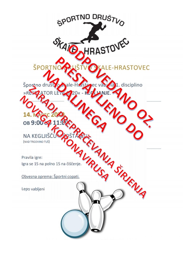 Vabimo vas na prvo disciplino za pokal Rekreator leta 2020, ki bo potekala na kegljišču v Šoštanju. Lepo vabljeni vsi krajani KS Škale-Hrastovec, KS Cirkovce ter KS Plešivec. Več kot nas bo, bolj zanimivo bo!