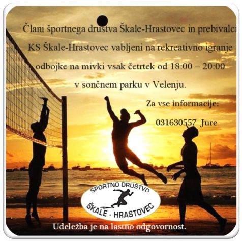 Z mesecem junijem vas Športno društvo Škale-Hrastovec vabi na rekreativno igranje odbojke na mivki vsak četrtek od 18.00 do 20.00 ure v Sončnem parku v Velenju.