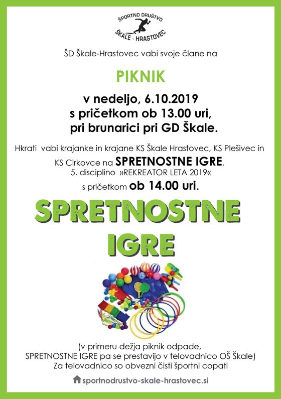 V nedeljo, 6.10.2019 vas Športno društvo Škale-Hrastovec vabi na piknik pod brunarico pri GD Škale. Piknik se bo pričel ob 13.00 uri. Da pa bo na pikniku bolj zanimivo in napeto, bodo na ta dan potekale spretnostne igre, ki štejejo tudi za Pokal Rekreator leta 2019.